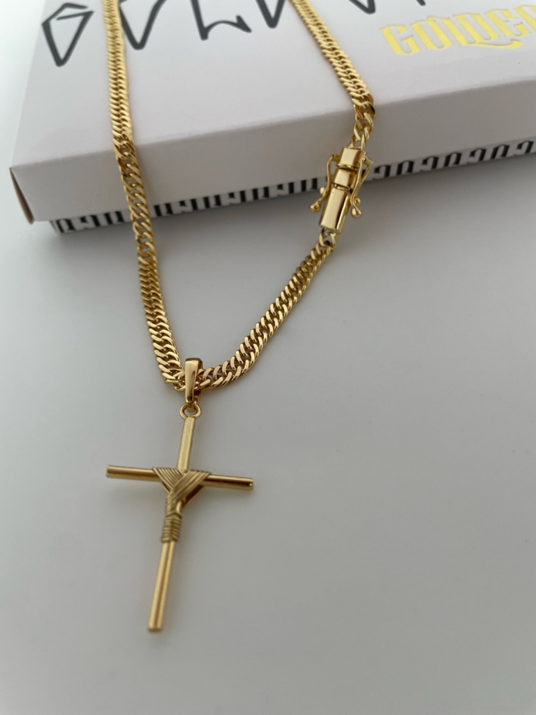 Corrente modelo GRUMET DUPLA LACRAIA FECHO TRAVA DUPLA com 4MM milímetros de espessura aproximadamente + PINGENTE CRUZ AMARRADA M - 4X2,5CM - BANHADO A OURO 18K. As peças possuem 2 tamanhos: